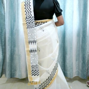 A contemporary fusion of peach coloured peony motifs combined with beautiful leaf imprints on a pristine cotton pure white backdrop – this Peony Garden saree is a sight to behold. A rich splash of colour lended by the floral motifs with the leaf imprints along with a contrasting golden zari border, this heritage kasavu saree will make you stand out in a crowd!