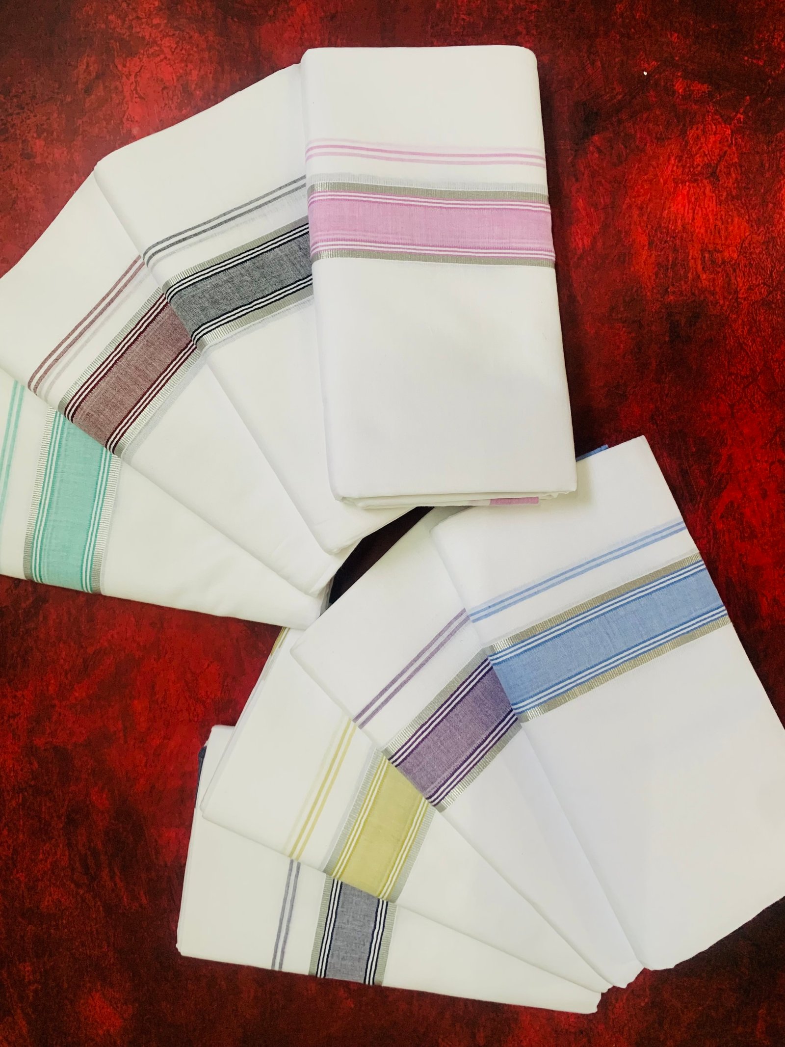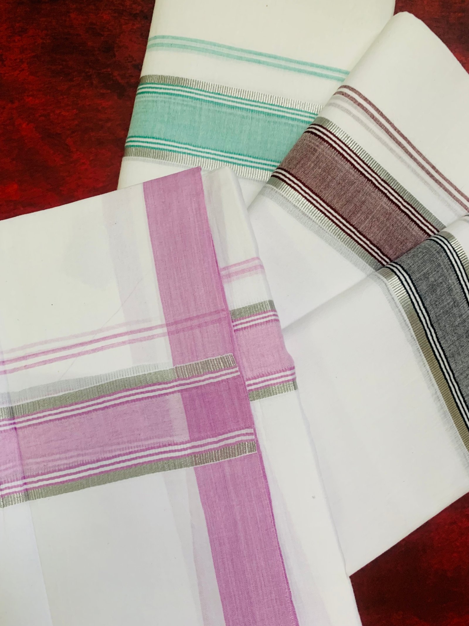 Elegant 4-meter pure cotton Kerala dhothis with silver kasavu borders in vibrant colors – perfect for weddings, festivals, and premium gifting.