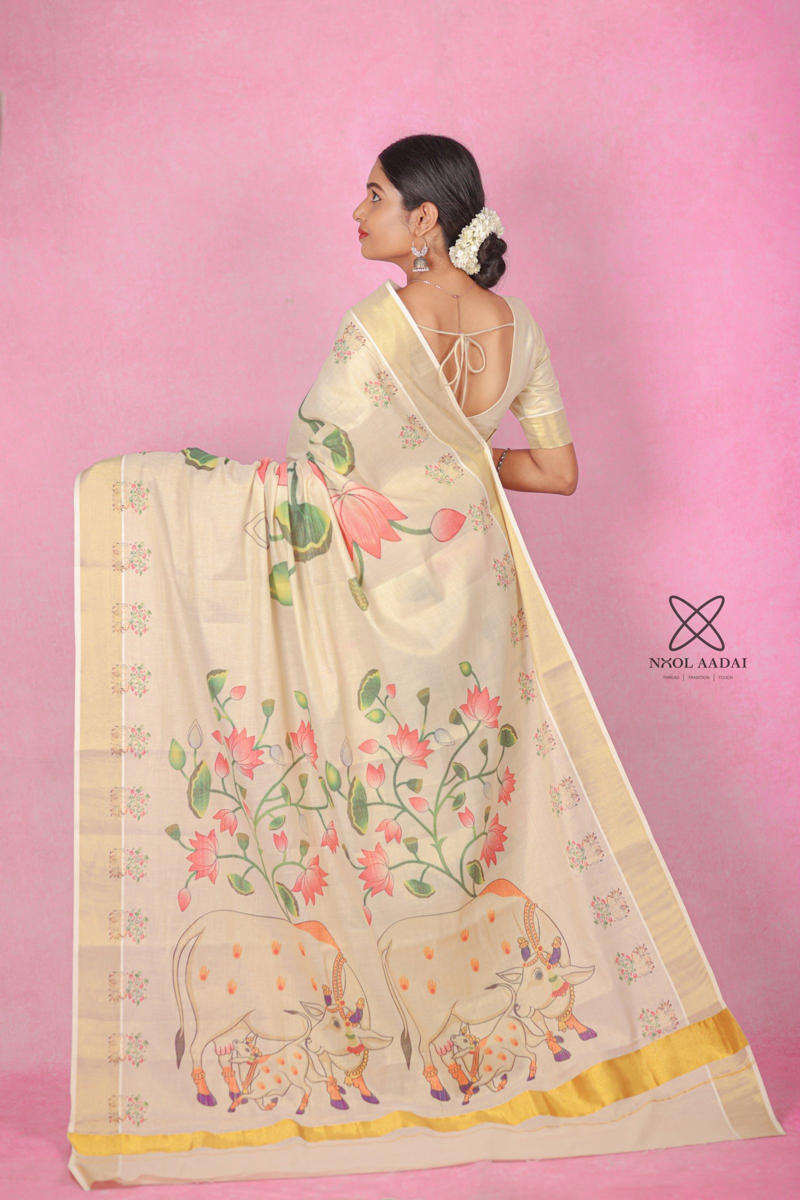 A graceful Kerala saree with digital floral prints and classic golden kasavu border — where tradition meets trend.