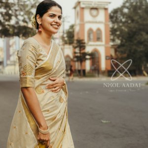 Staying true to the traditional Kerala saree color palette, this saree boasts a pristine white base with a contrasting gold border, beautifully complemented by the intricate embroidery. The saree features a unique matrix-like embroidery pattern, meticulously crafted to add a modern twist to the traditional Kerala saree. The geometric design enhances the saree’s visual appeal, making it a standout piece in your wardrobe.