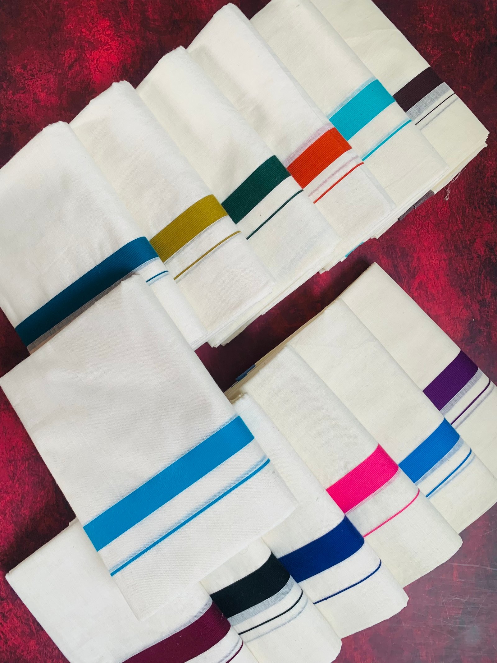 Classic cream-colored 100% cotton dhoti with vibrant colour borders – 4 meters in length, perfect for traditional and festive occasions.