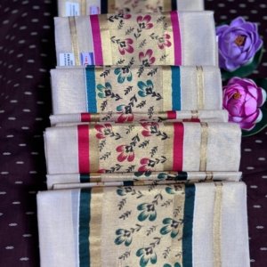 The Tissue Set Mundu has a full stiped golden jari all over the body with golden boarder at the bottom. The munthani has Colour Boarder with Golden Fancy Zari print Set with modern infused with different colour elements. This set mundu is perfect for those who appreciate a blend of classic and Grand ethinic attire.